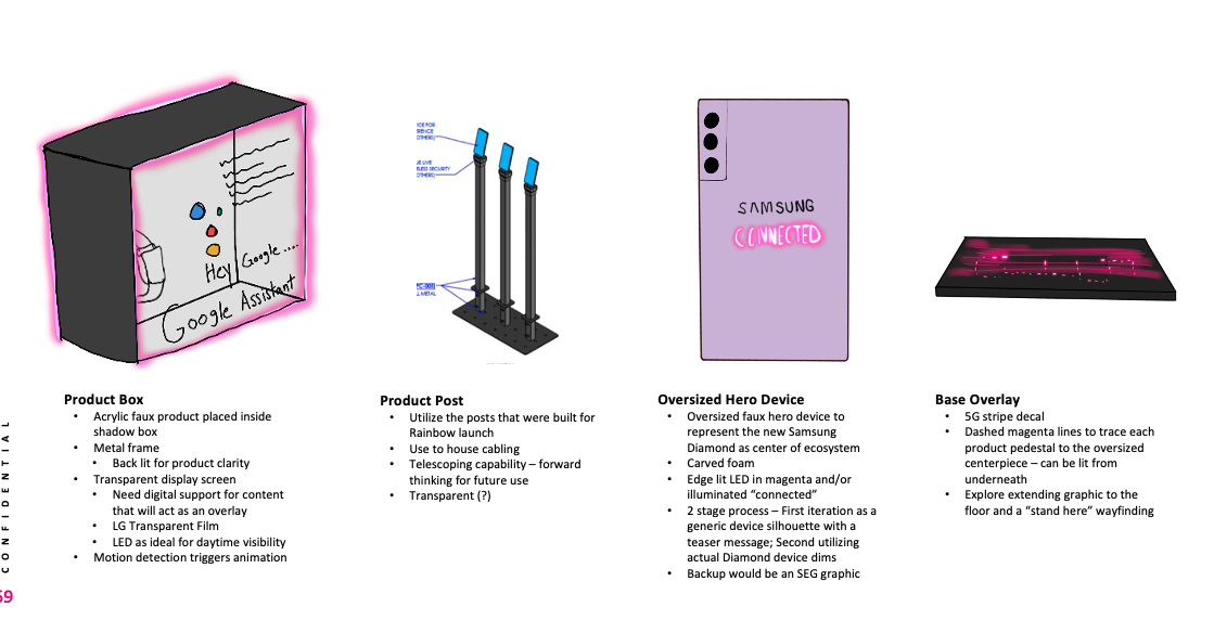Collaborating with the Samsung Product team, I spearheaded the creation of an introducer display at the front-of-store. My goal was to captivate customers and immerse them in the world of the latest Samsung device—the Samsung S23. Each crafted product box represented a unique feature or aspect of the S23. By combining layered acrylic and dynamic elemental lighting, we conjured an illusion of movement, enticing customers to explore and discover.